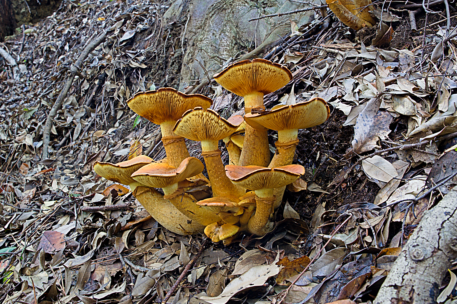 初めての場所であり、元になる情報提供いただいた方からの地図と写真の情報を元に行くので期待しながら狭い林道を車で登って行ったところ、発生地のすぐ近くには展望の良い小さな公園があり、そこに駐車して少しの時間眺望を楽しんだ。その後、すぐ近くの遊歩道に沿って目的のキノコを探しながら登ってみた。山は乾燥していてなかなかキノコが見つからないうちに最上部まで来てしまったので、場所を再度教えていただけるように情報提供者に電話・確認していただいた後、該当場所を探してみたがなかなか見つからず若干諦めムードになってきたところで最初の1本目を見つけることが出来た。写真を撮るため周りの枝や枯葉をどけていると次々に見つかり、思った以上に沢山見ることが出来てここまで来た甲斐があった。