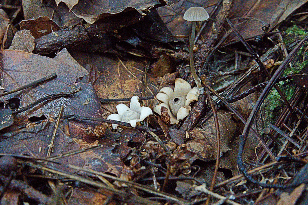 肝心のキノコの方だが、園内はここのところ雨が降っていないということで、他の場所同様、ここでも例年と比べてすくなかった。尾根筋に近い所では小型のキノコがたまに見つかる程度で、谷筋に近い低い所にいってやっとある程度のキノコが見られるという感じになっていた。