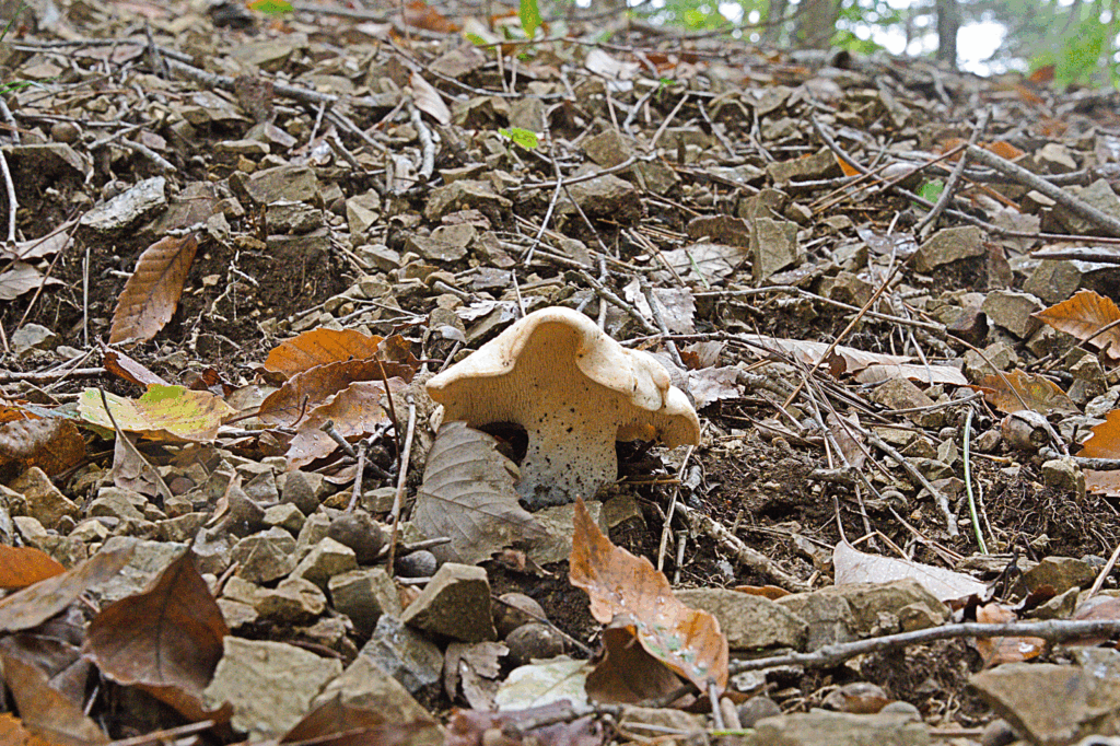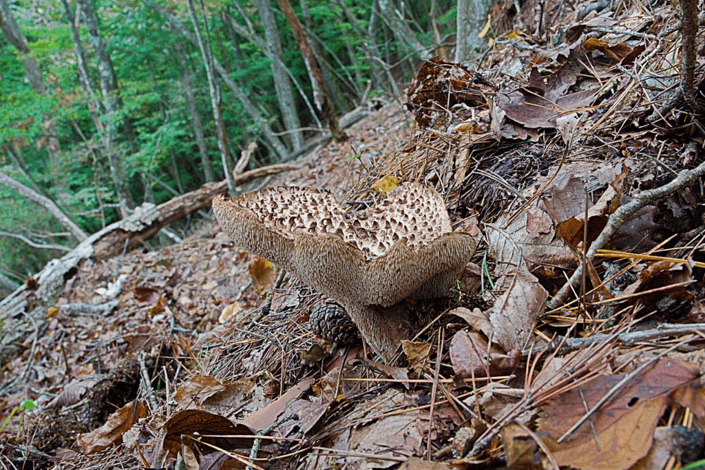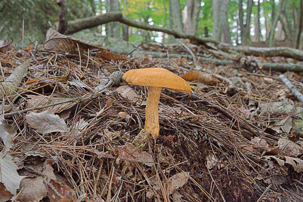 今回も県外遠征。目的の山は過去の実績で当たりはずれが大きい山の為、今年はどうか行ってみて確認する他ない。登り口について山へ入ったが、すぐの斜面にはほとんどキノコが無いので、今年もはずれかと危惧しながら仲間と進んだ。今年の夏の雨量不足が影響しているのか尾根筋に近い場所にはキノコが見られず、仲間がキノコを見つけた位置も尾根から相当下がった地点だった。探す位置を少し斜面の下にした方がありそうだということで探し始めると少しずつではあるがキノコが発生していたので撮影。