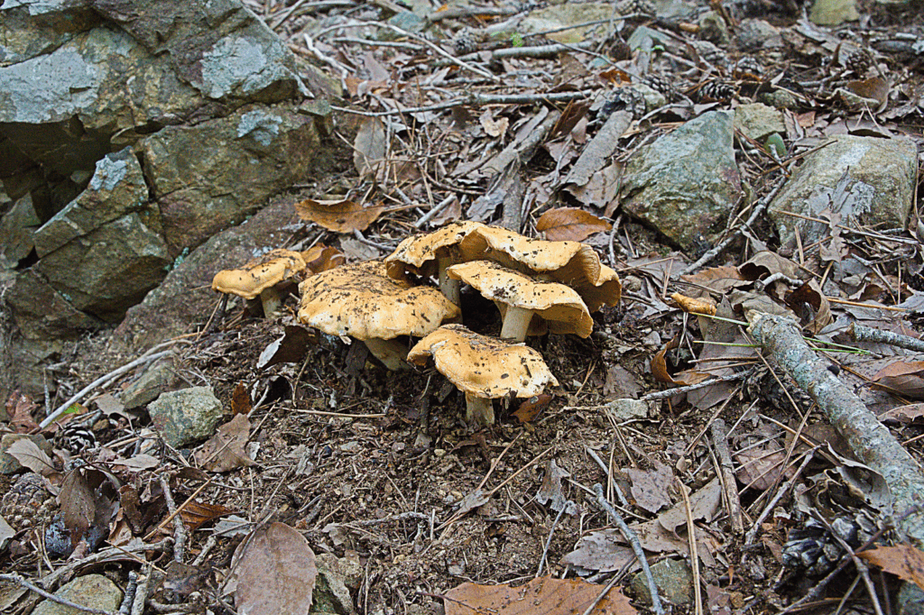 その後も斜面の下部を探したがあまりキノコがなく、地続きの横の尾根に進路を変えて進んだ。歩き始めると所々にポツポツとキノコが出ていたので撮影しながら前進。