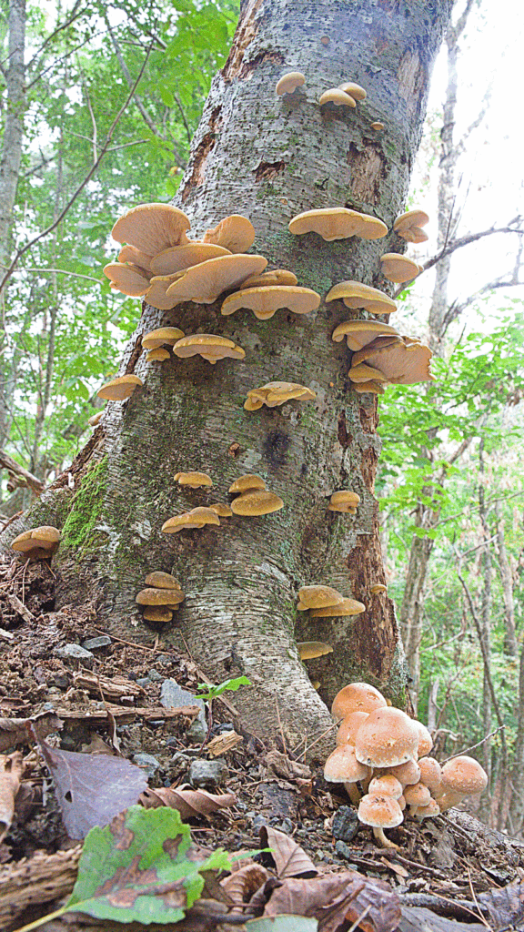 一通り見終えたので、皆で昼食休憩をとった後、元のコースを辿って車の駐車地点まで戻った。林道脇に出ていたキノコを撮影していると、林道の下の斜面にもキノコがあり、なんと、まだ気温が少し高いと思っていたところに思いがけずムキタケが出ていた。同じ木の根元にクリタケもあり写真的に面白いコラボのため撮影した。