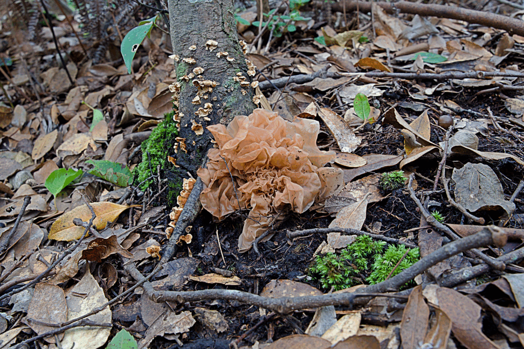 山へ入ると前日の雨で林内は湿ってはいたが、それまでは乾燥が続いていたようでマツタケはおろか他のキノコもほとんど見られない。自分の知っているシロのある山をいくつか回ってみたがマツタケが出る気配が全くない。今日は風も強く、ウィンドブレーカーを着ていないと寒いくらいの気温で、今までの年ならこのくらいの気温になれば発生してくるくらいの気配はあるものなのだが・・・。他のキノコもほぼ無いので、カメラを構える事もなく終わってしまうかと思われたが、途中に前日の雨で生気をとりもどしたハナビラニカワタケがあったので撮影した。